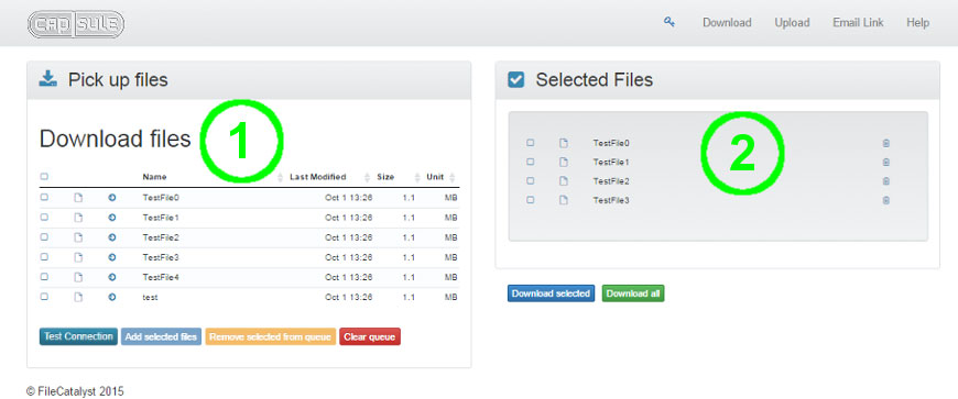 Similar to the other two browse areas defined above, this area allows users to select all or some files from the received link. Clicking the “add” icon (a right-arrow in this example) adds an individual item to the selected files area. Checkboxes allow selection of multiple items, which are added to the selected files with the button found at the bottom of the browse area.